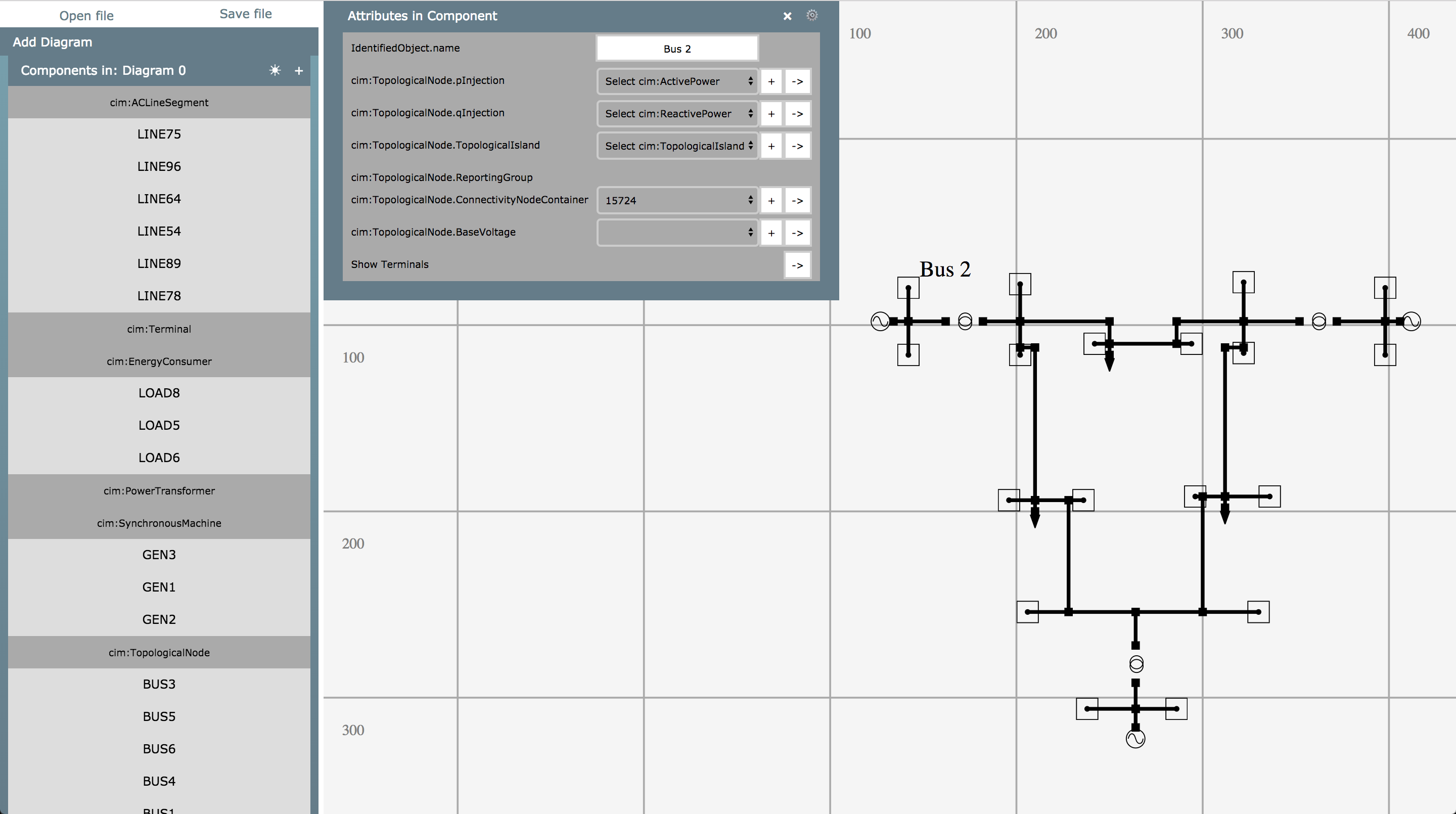 Standardmäßig wird das WSCC 9-bus Bus-System geladen. Sie können ihre eigenen CIM Dateien durch Klicken des “Open file” Knopfes und Hochladen eines oder mehrerer CIM Dateien laden. Sie können das Diagramm mithilfe der Pfeiltasten verschieben. Zum Zoomen drücken Sie Strg + Pfeiltaste hoch/runter.